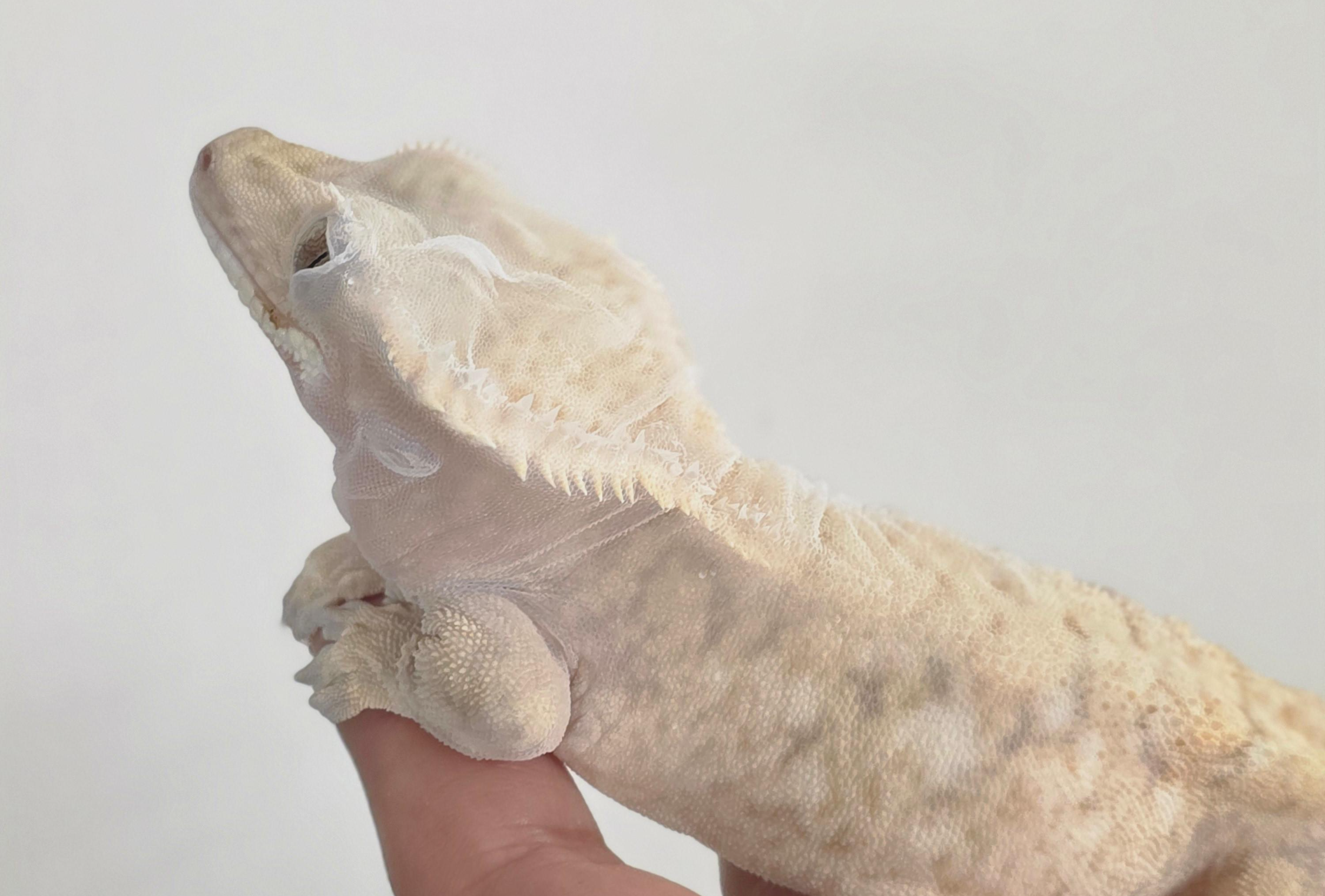 "어? 몸이 하얗게 떴는데 밥을 안 먹어요." 당연합니다. 크레스티드 게코는 탈피할 때 벗겨진 자기 피부(껍질)를 뜯어먹습니다. 그 껍질에도 단백질 등 영양분이 있거든요.