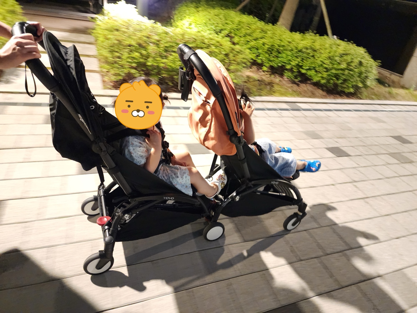 그래서 쌍둥이 유모차와 요요 휴대용 유모차를 상황에 맞게 번갈아 가면서 태워 다녔어요.