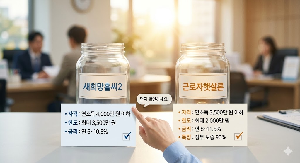 [2026년 최신] 내 소득으로 얼마까지? 새희망홀씨2 vs 근로자햇살론 조건·한도 완벽 비교